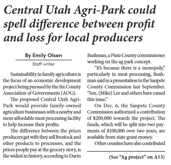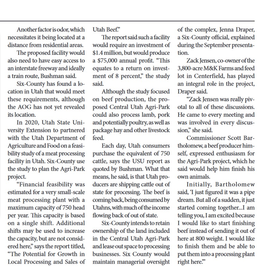 The Six County economic development project utilized this study for their project. Although the study focused on beef production, the proposed Central Utah Agri-Park would also process lamb, pork, and potentially poultry, as well as package hay and other livestock feed.