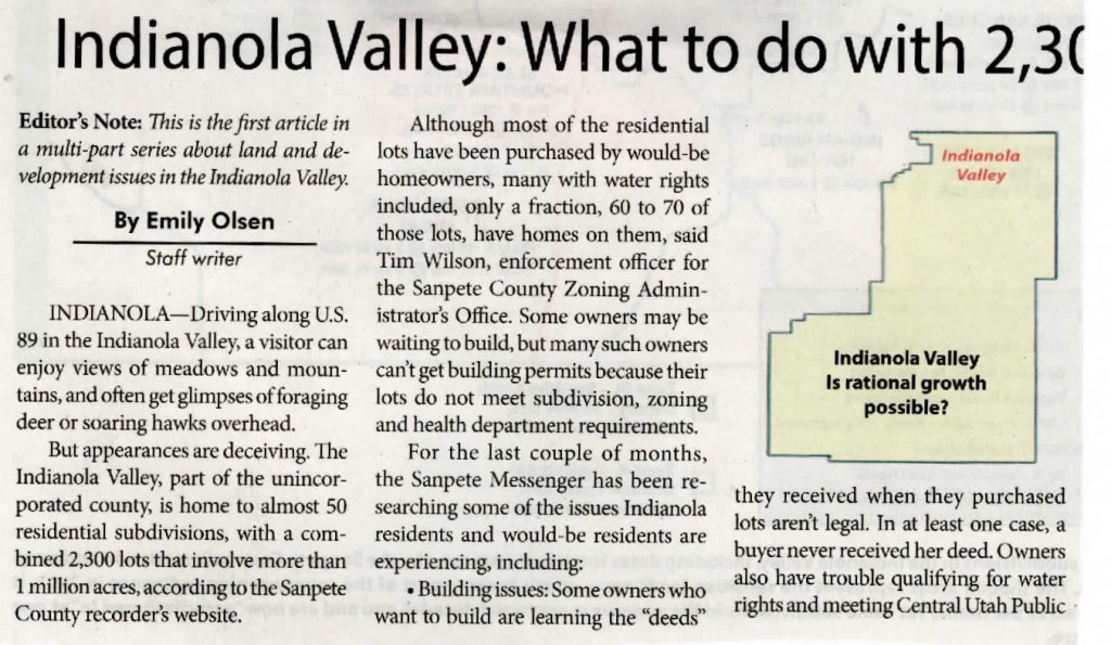 But appearances are deceiving. The Indianola Valley, part of the unincorporated county, is home to almost 50 residential subdivisions, with a combined 2,300 lots that involve more than 1 million acres, according to the Sanpete County recorder’s website.