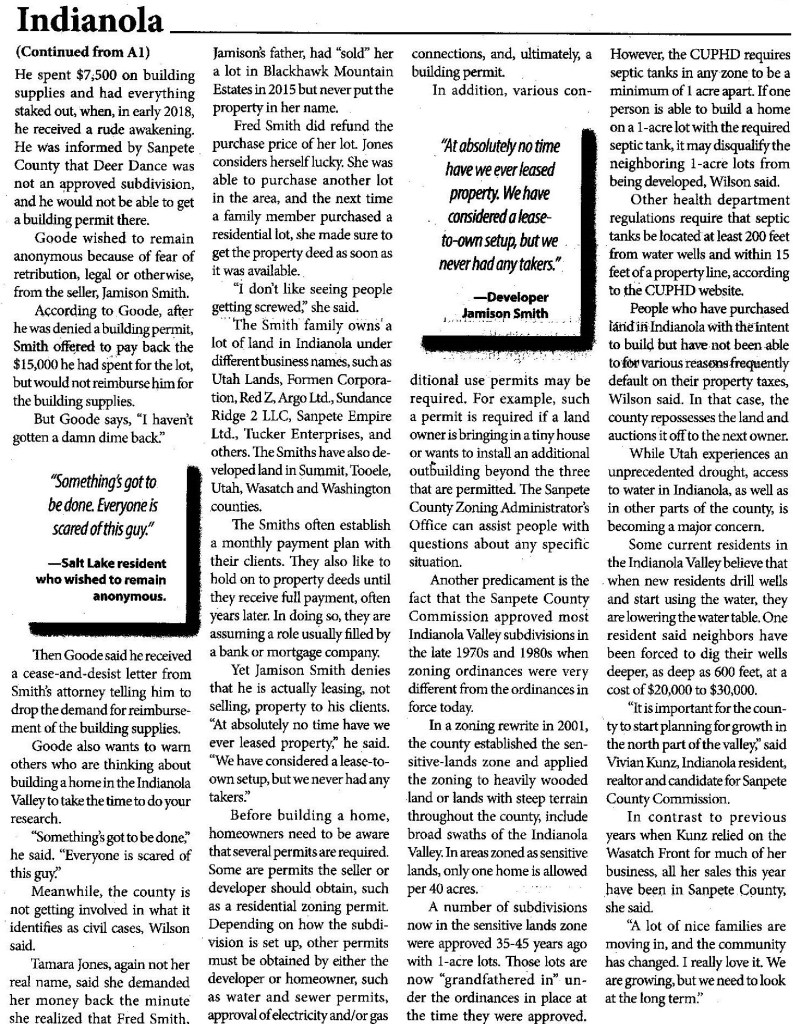 The Smith family owns a lot of land in Indianola under different business names, such as Utah Lands, Formen Corporation, Red Z, Argo Ltd., Sundance Ridge 2 LLC, Sanpete Empire Ltd., Tucker Enterprises, and others. The Smiths have also developed land in Summit, Tooele, Utah, Wasatch and Washington counties.